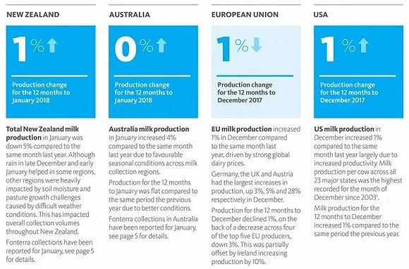 最近,恒天然(Fonterra)在其官網(wǎng)上披露了2018年2月最新財務數(shù)據(jù),公司今年1月國內牛奶產量同比下降5%,原因是“糟糕的天氣狀況導致土壤濕度不夠,進一步影響了牧草生長和奶牛產奶”。
